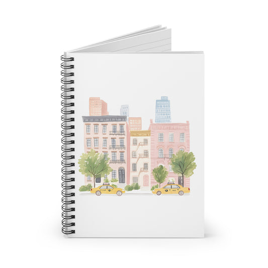 City Streetline Spiral Notebook — Pastel Urban Buildings with Yellow Taxi (Ruled)