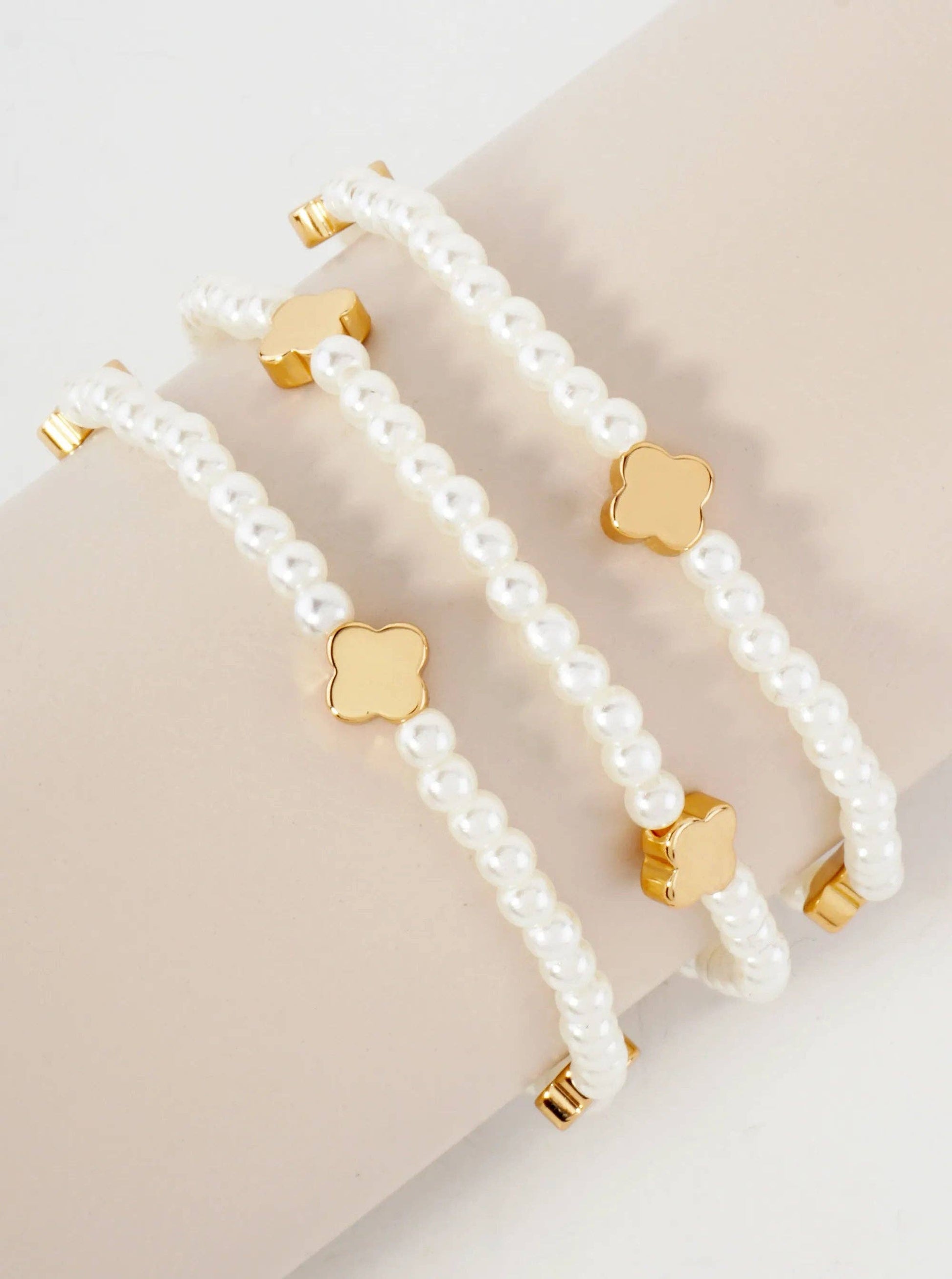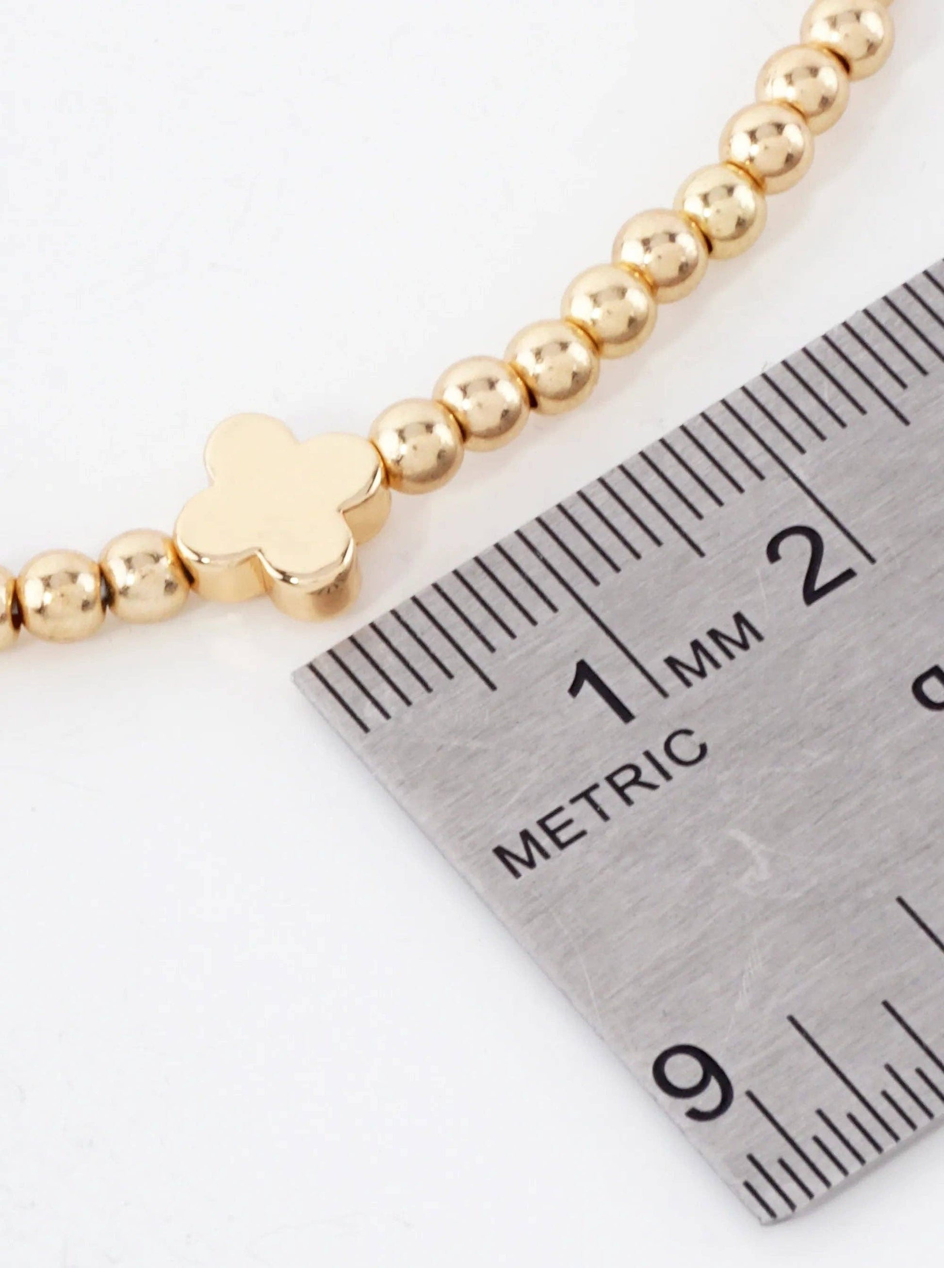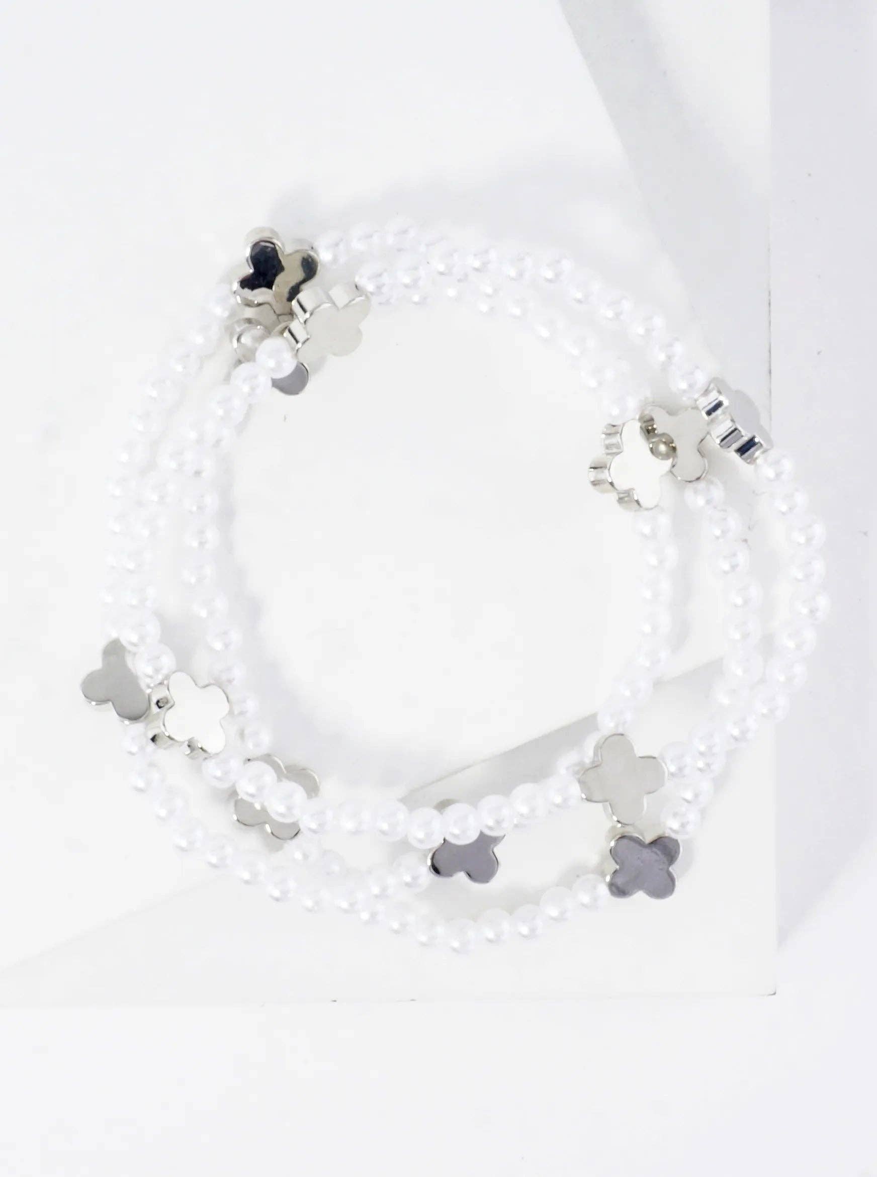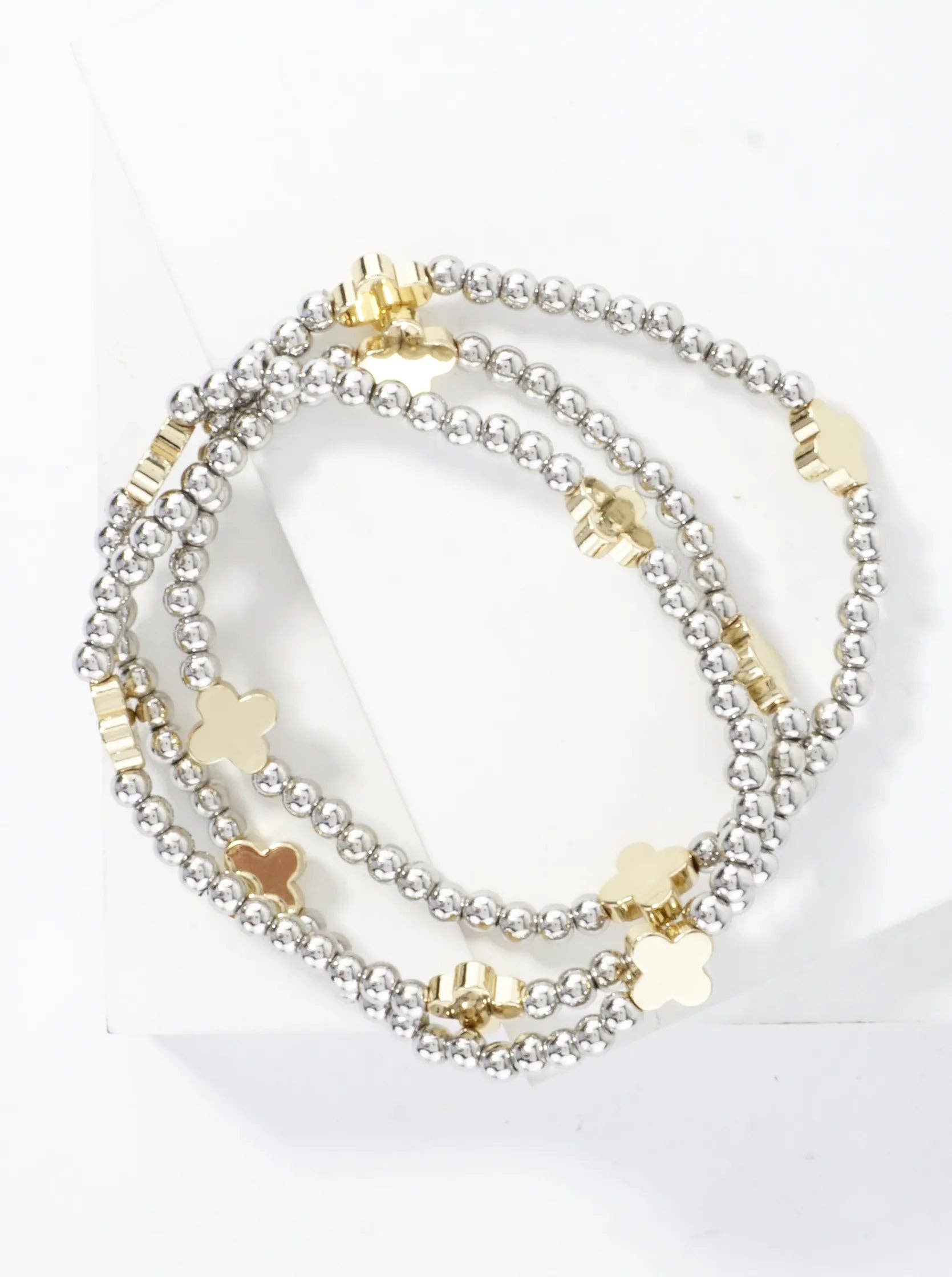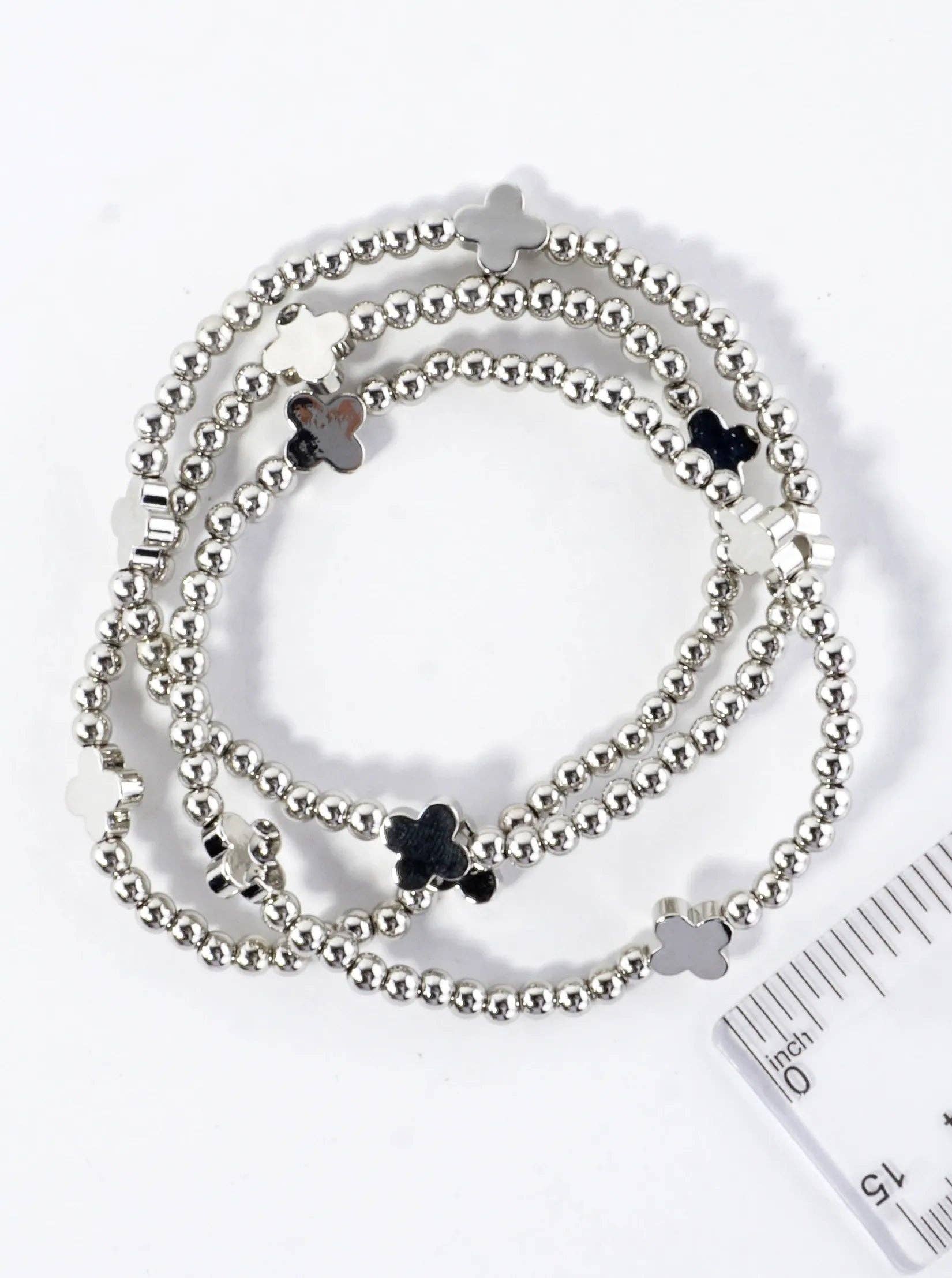3PC-Set Metallic Beads Quatrefoil Stackable Stretch Bracelets: Rhodium
