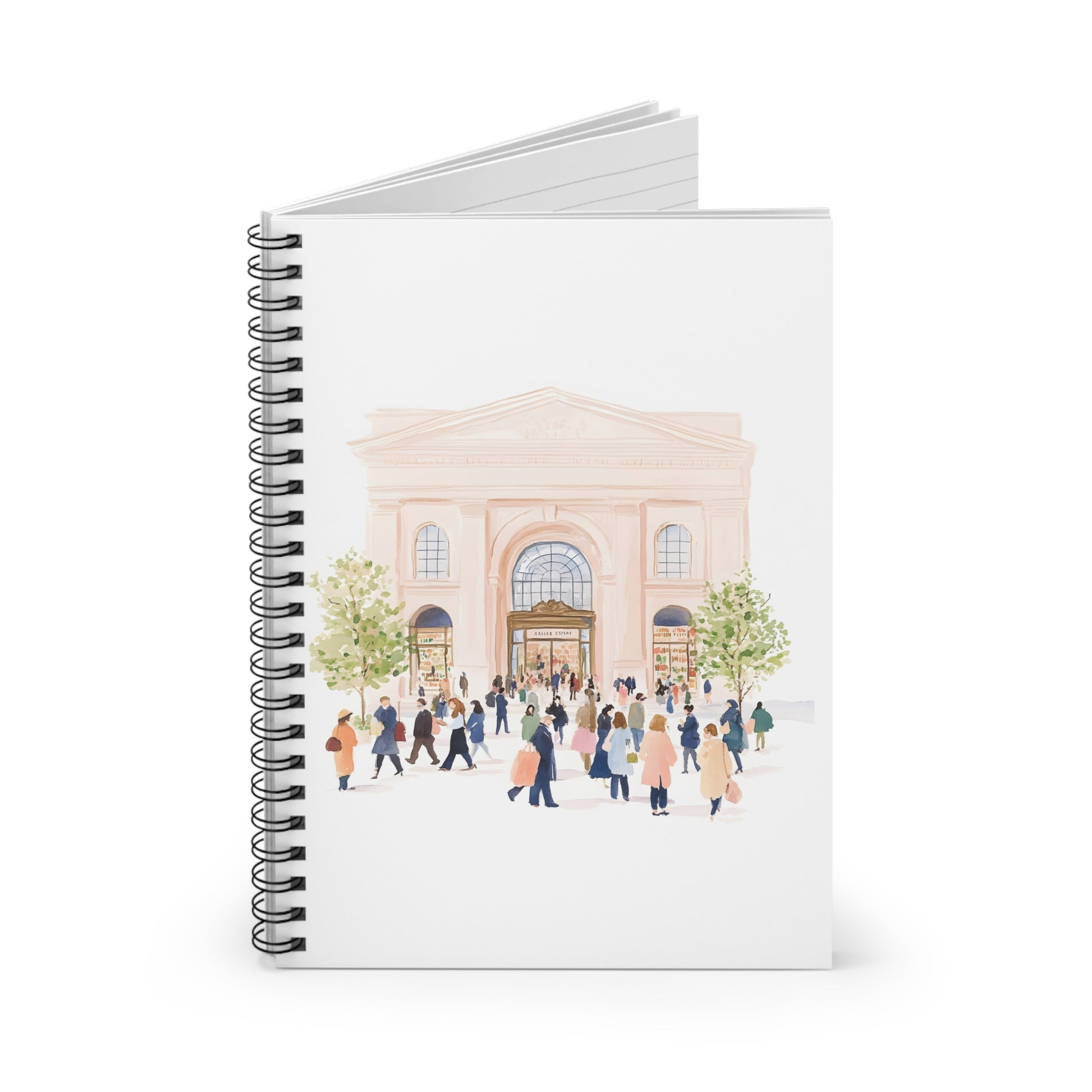 A soft, watercolor scene wraps the cover of this compact spiral notebook — a warm city entrance framed by trees and a friendly crowd, rendered in peachy tones and gentle brushstrokes. The ruled interior pages (90gsm) invite everyday notes, lists, and ideas to flow neatly, while a metal spiral lets pages turn smoothly or be removed when a thought needs to travel. A dark grey back cover and an internal document pocket keep loose receipts, tickets, or sketches secure. At 6" x 8", it slips into a tote or satchel and feels at home in cafés, classrooms, and commuter pockets — a quiet companion for anyone who notices small urban moments and likes to capture them on the go.