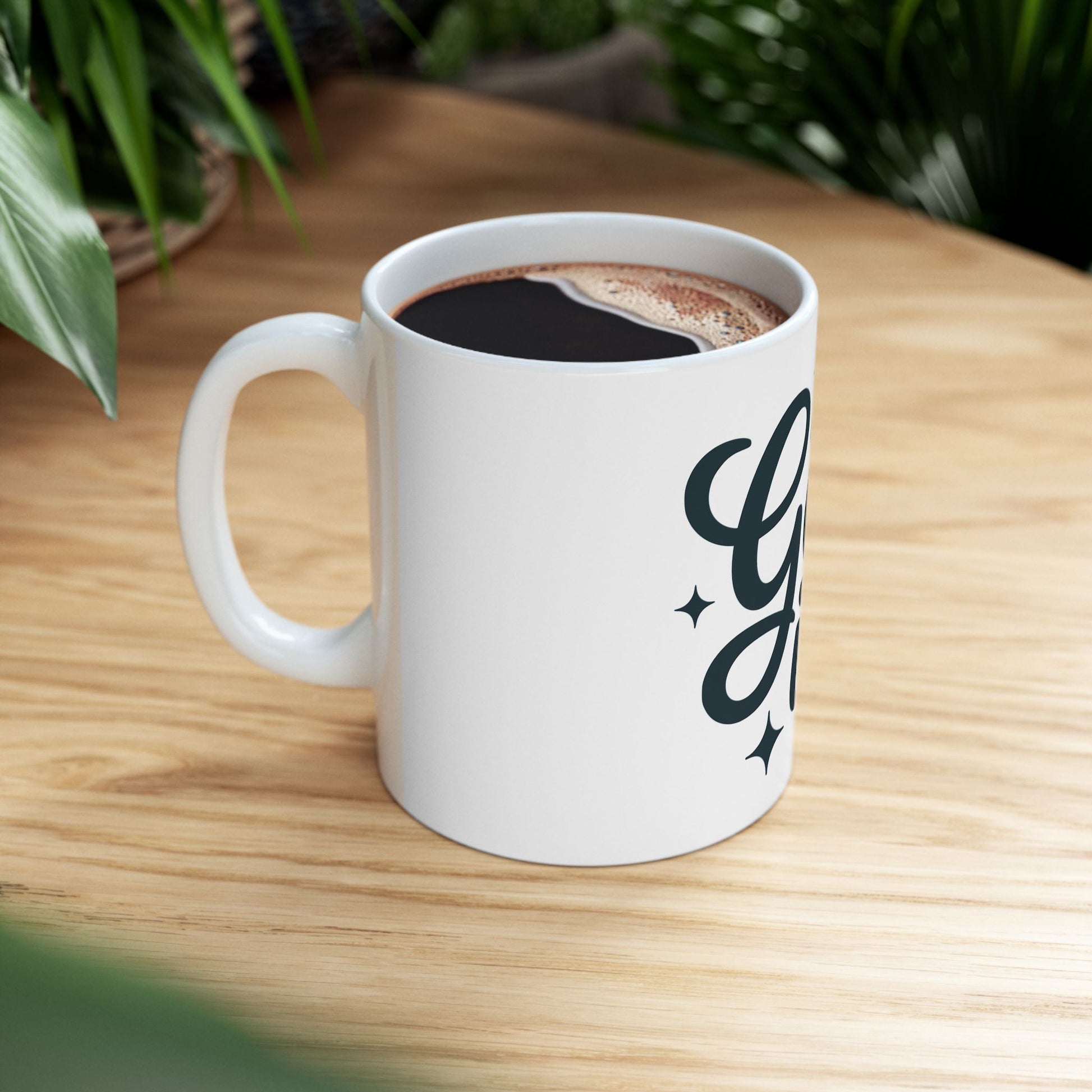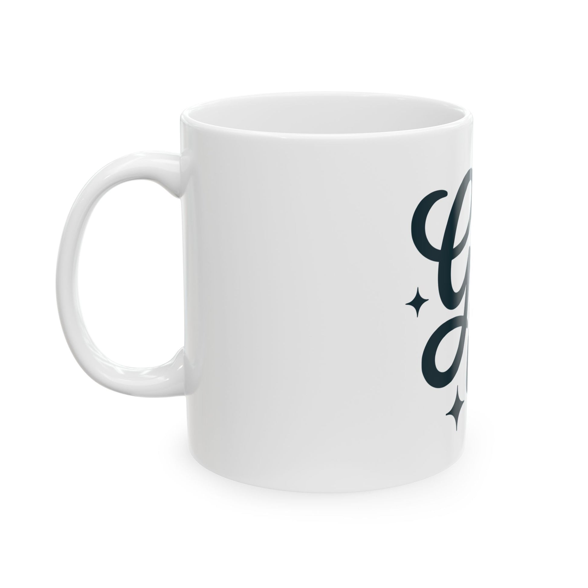 A glossy white ceramic mug that carries a quiet, uplifting message in graceful hand-lettering. The bold script reads as a gentle reminder, surrounded by tiny star accents that catch the eye and soften the sentiment. Smooth to the touch with a comfortable C-handle, this mug brings a moment of calm to morning coffee, an evening tea break, or a busy desk routine. It feels like a small pause — a breath and a hopeful thought — that fits easily into daily life or a cozy corner of your home.
