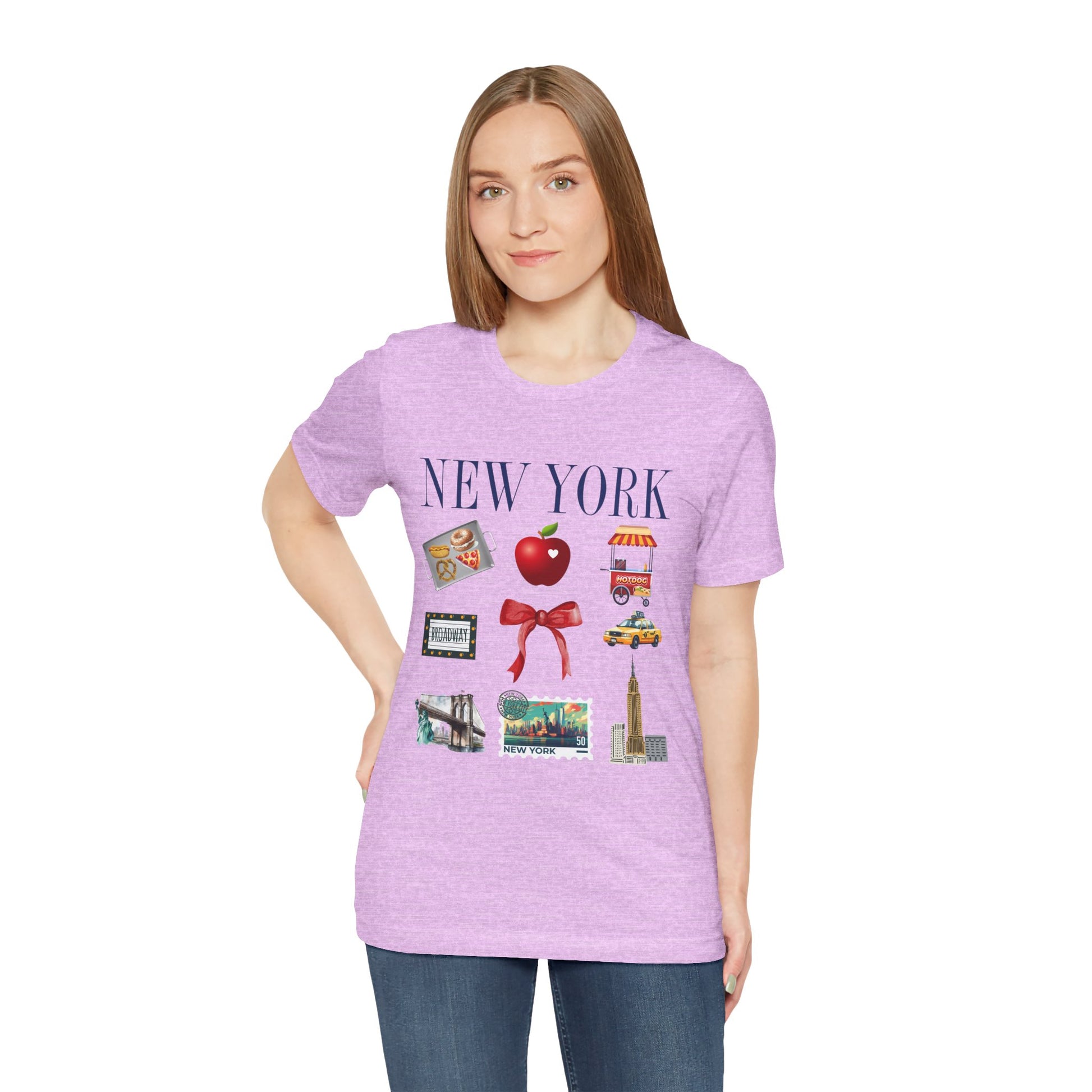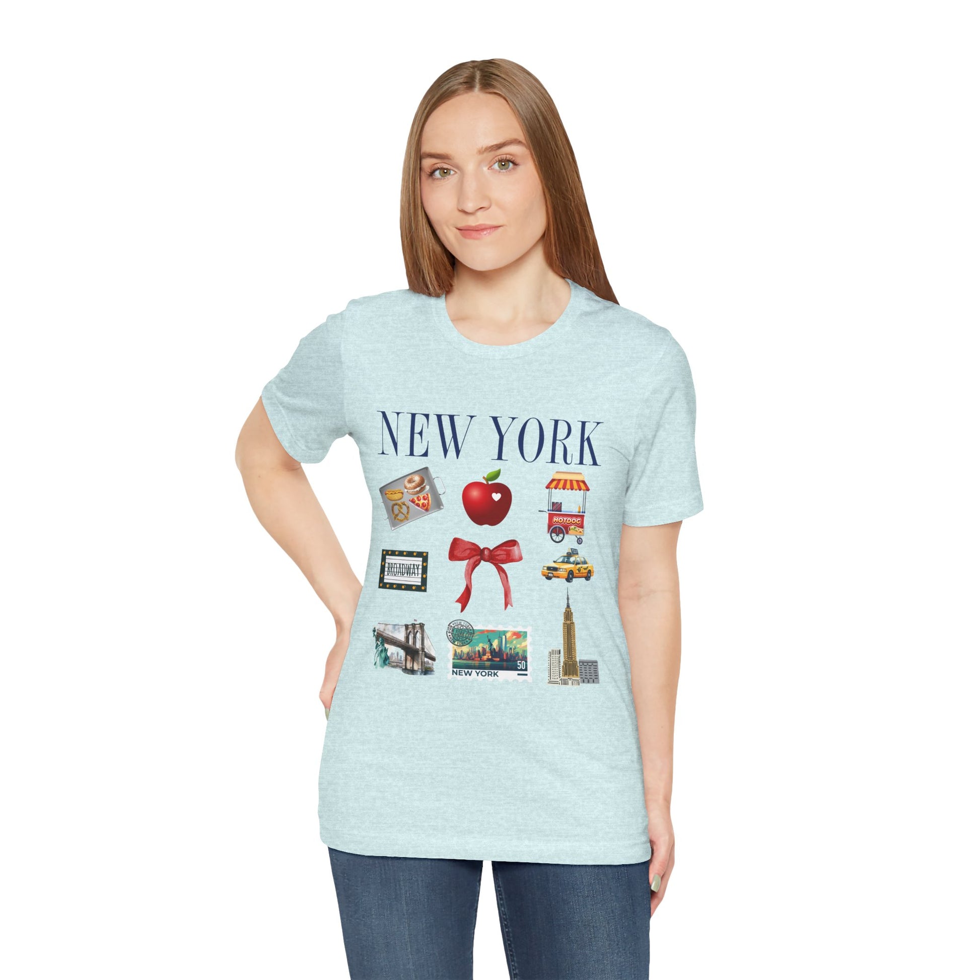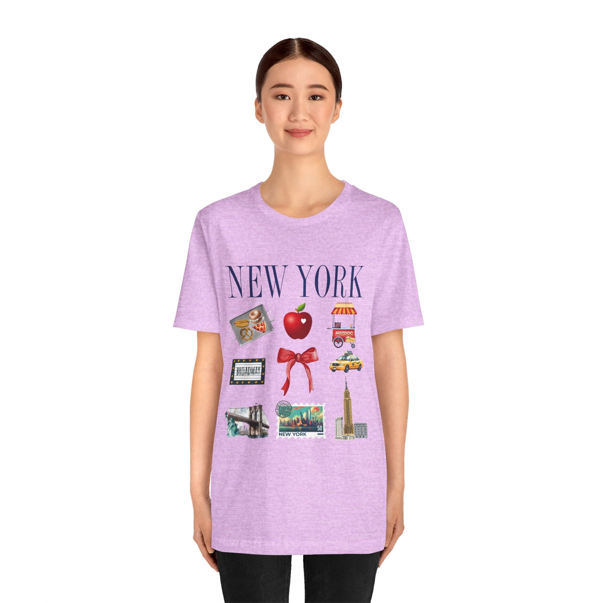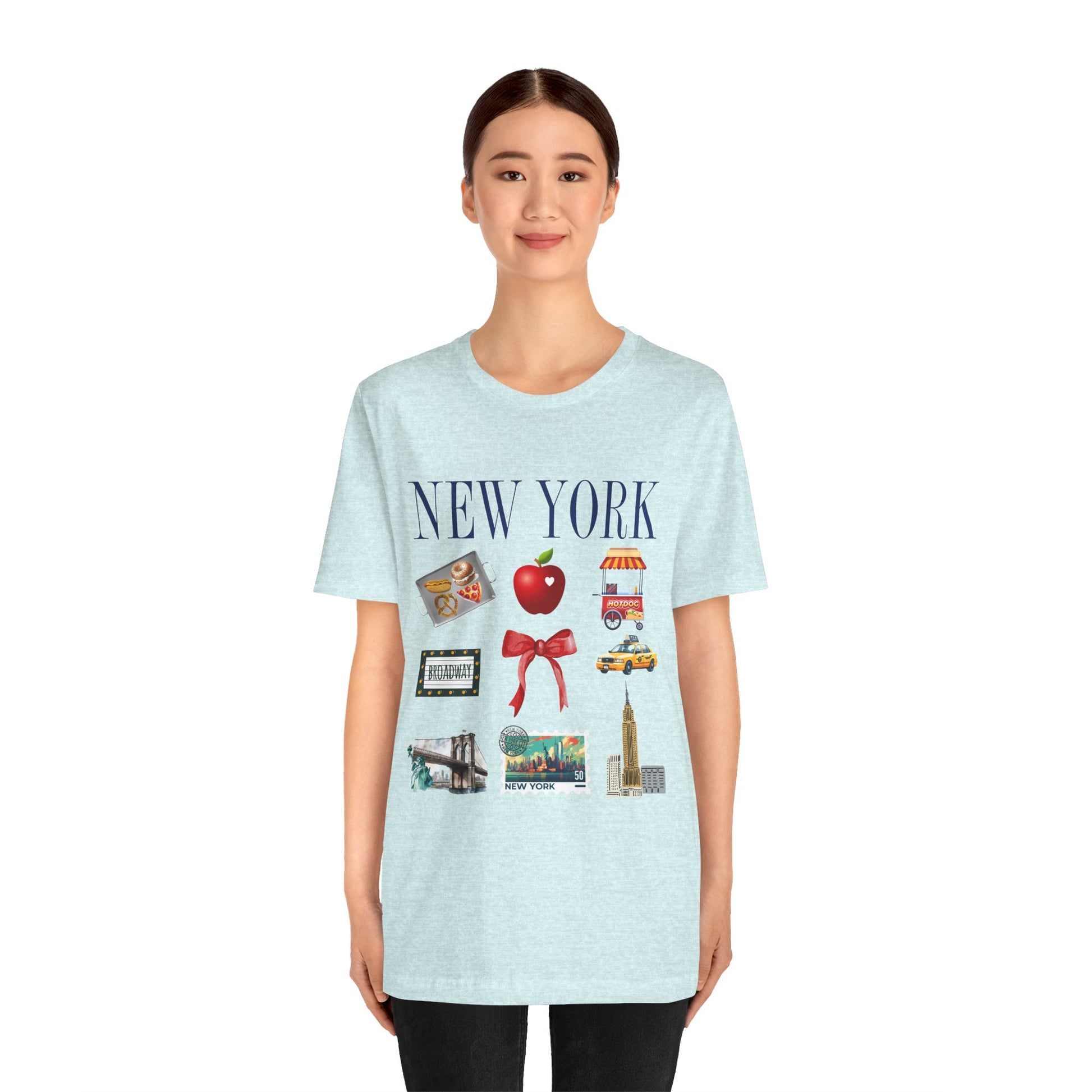 Lightweight, breathable, and effortlessly casual — this Bella+Canvas jersey tee celebrates New York with a playful collage of city icons. Soft Airlume combed and ring-spun cotton gives the shirt a smooth hand and easy drape, while side seams and shoulder tape keep the fit looking sharp after many wears. The crew neckline and retail cut sit neatly for everyday layering or a simple standalone look. Imagery includes an apple, yellow taxi, skyline elements and vintage-style mementos arranged beneath a classic “NEW YORK” header, evoking strolls through neighborhoods, late-night pizza runs, and those small, unforgettable city moments. Ethically made and REACH certified, the tee is finished with a tear-away label for comfort and designed for adult sizes.