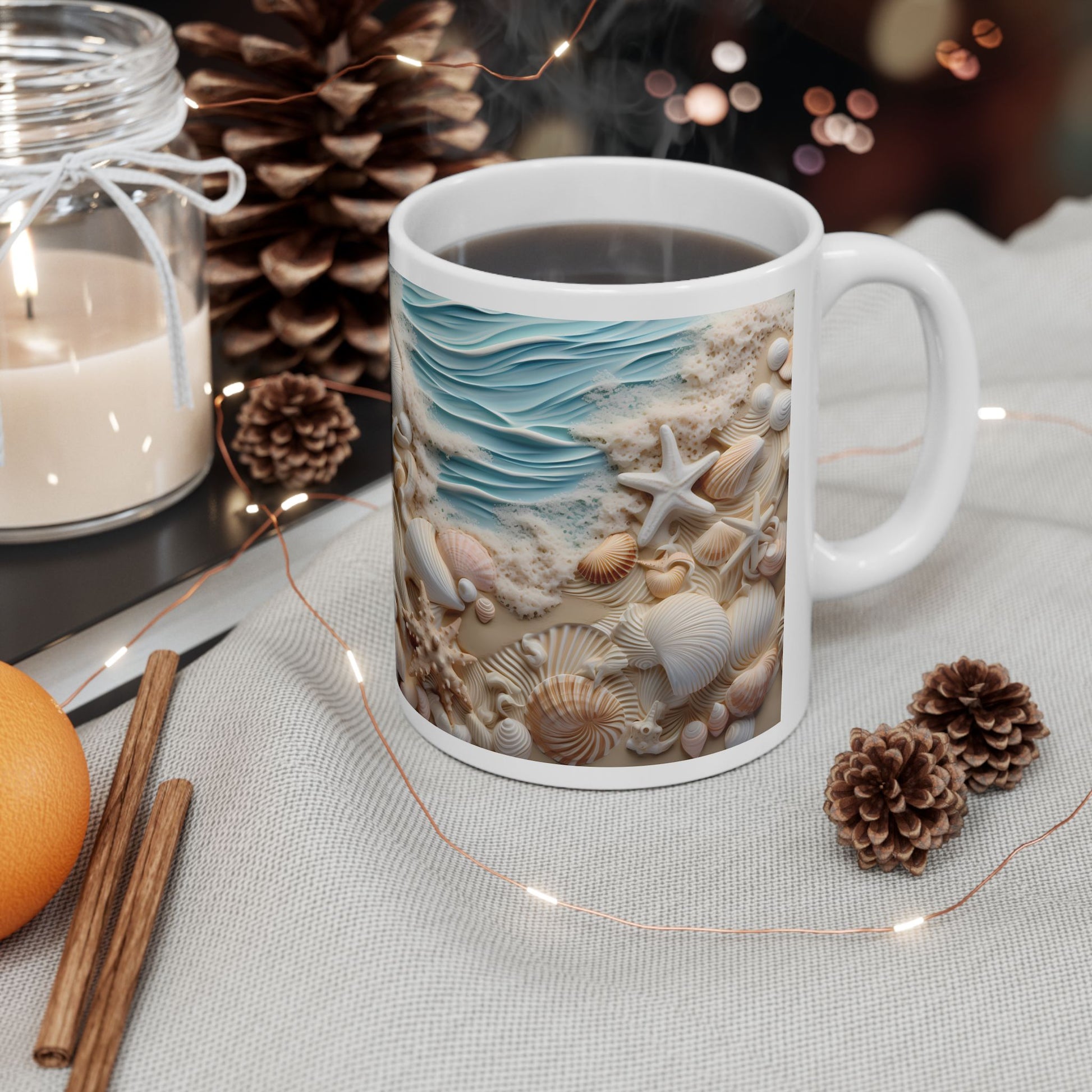 Morning by the shore, captured on glossy ceramic. This 11oz or 15oz mug wraps a calm, symmetrical seashell collage around its curve — soft sand tones, tiny starfish, and a pale blue horizon come together like a quiet tide pooling in a collection box. Hold it and feel a coastal pause: slow sips, salt air memories, and the hush of shells clinking together. It sits easily in your hand with a comfy C-handle and bright, durable printing that stays true after many washes. Use it for ritual mornings, late-night sketching, or as a small, thoughtful accent on a bookshelf or bedside table.